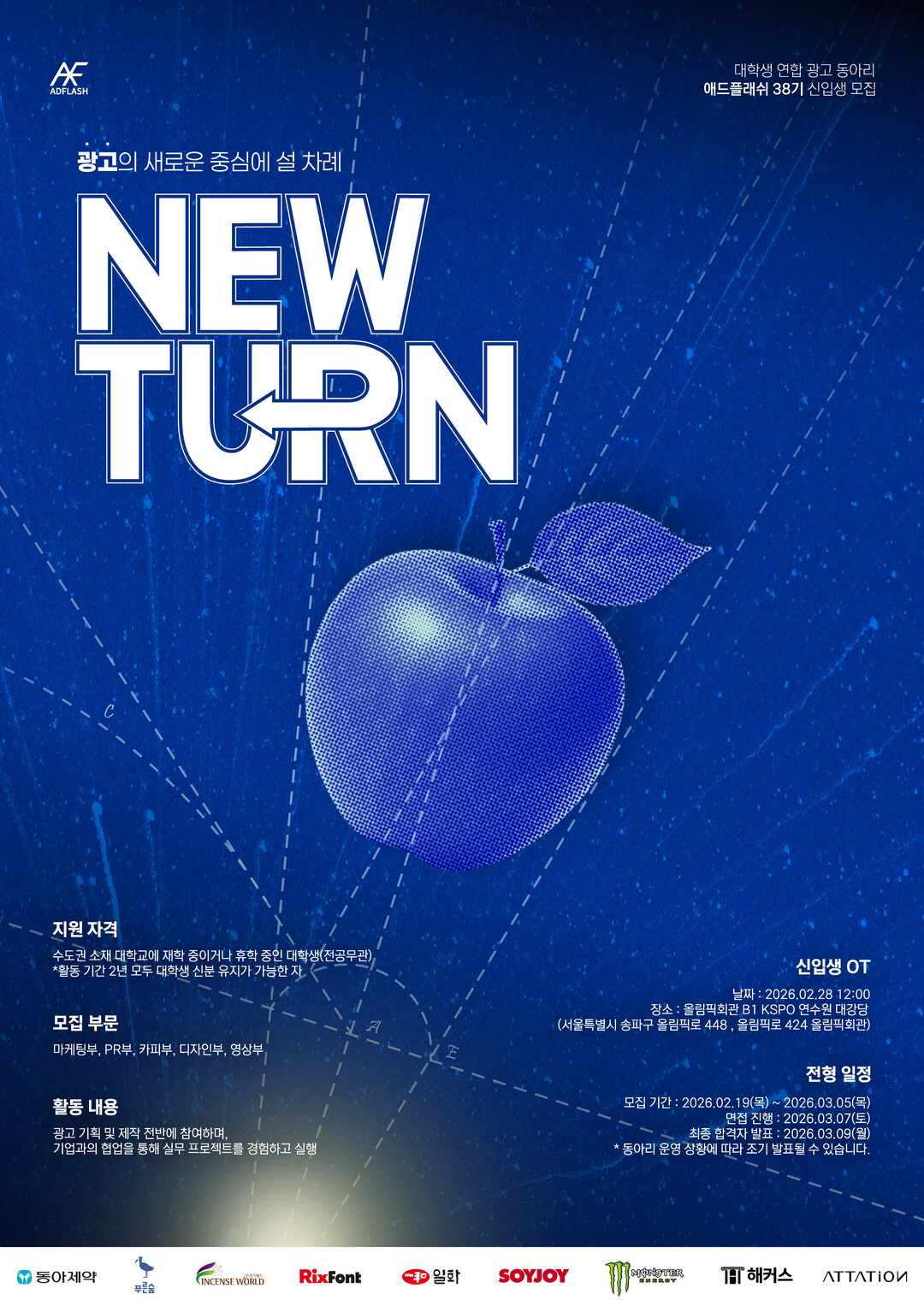 [피앤피뉴스=마성배 기자] 국내 최대 규모의 대학생 연합 광고동아리 ‘애드플래쉬(ADFLASH)’가 2026년 38기 신입 부원을 모집한다. 올해 모집 슬로건은 ‘광고의 새로운 중심에 설 차례, NEW TURN’으로, 작은 아이디어 하나가 세상의 흐름을 바꿀 수 있다는 메시지를 담았다.